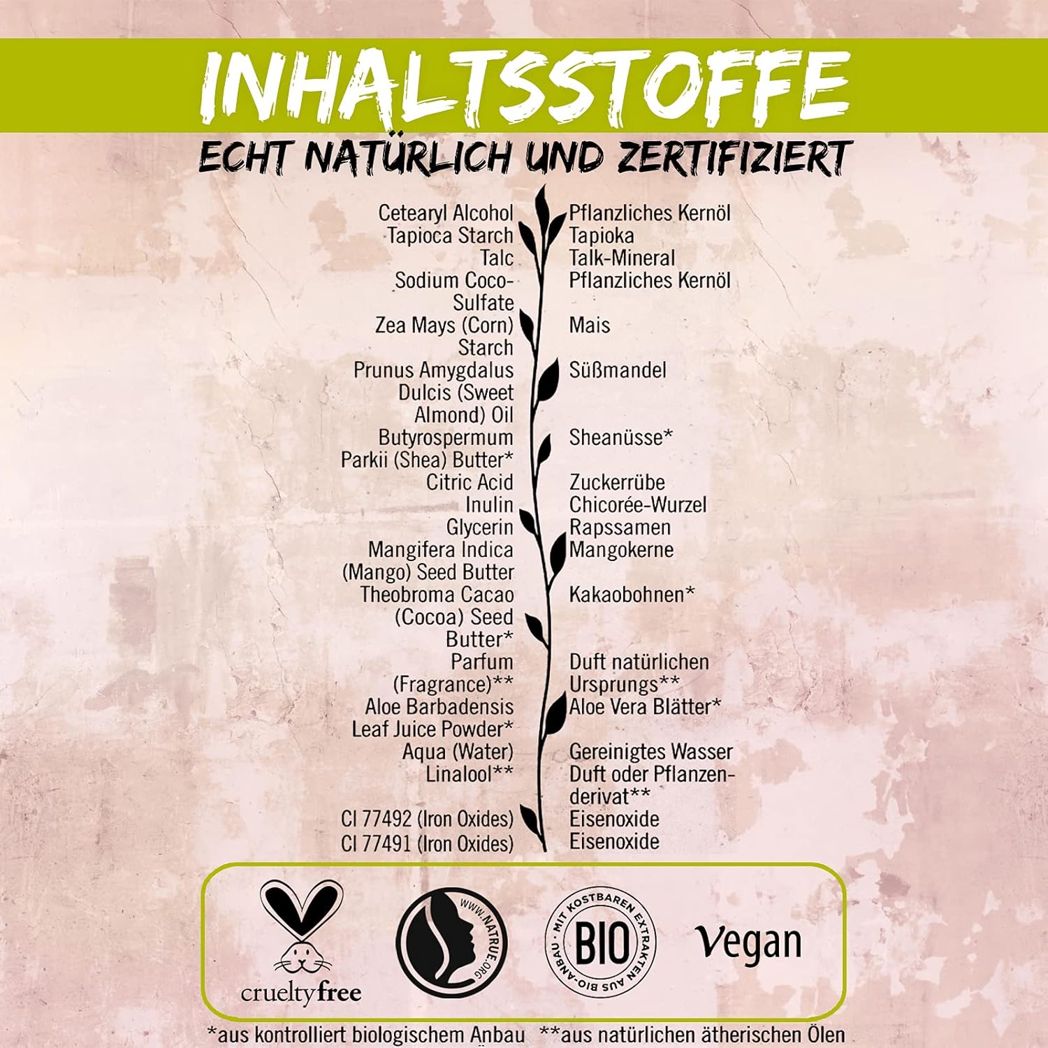 Cetearyl Alcohol, Tapioca Starch, Talc, Sodium Coco-Sulfate, Zea Mays (Corn) Starch, Prunus Amygdalus Dulcis (Sweet Almond) Oil, Butyrospermum Parkii (Shea) Butter*, Citric Acid, Inulin, Glycerin, Mangifera Indica (Mango) Seed Butter, Theobroma Cacao (Cocoa) Seed Butter*, Parfum (Fragrance)**, Aloe Barbadensis Leaf Juice Powder*, Aqua (Water), Linalool**, CI 77492 (Iron Oxides), CI 77491 (Iron Oxides).
